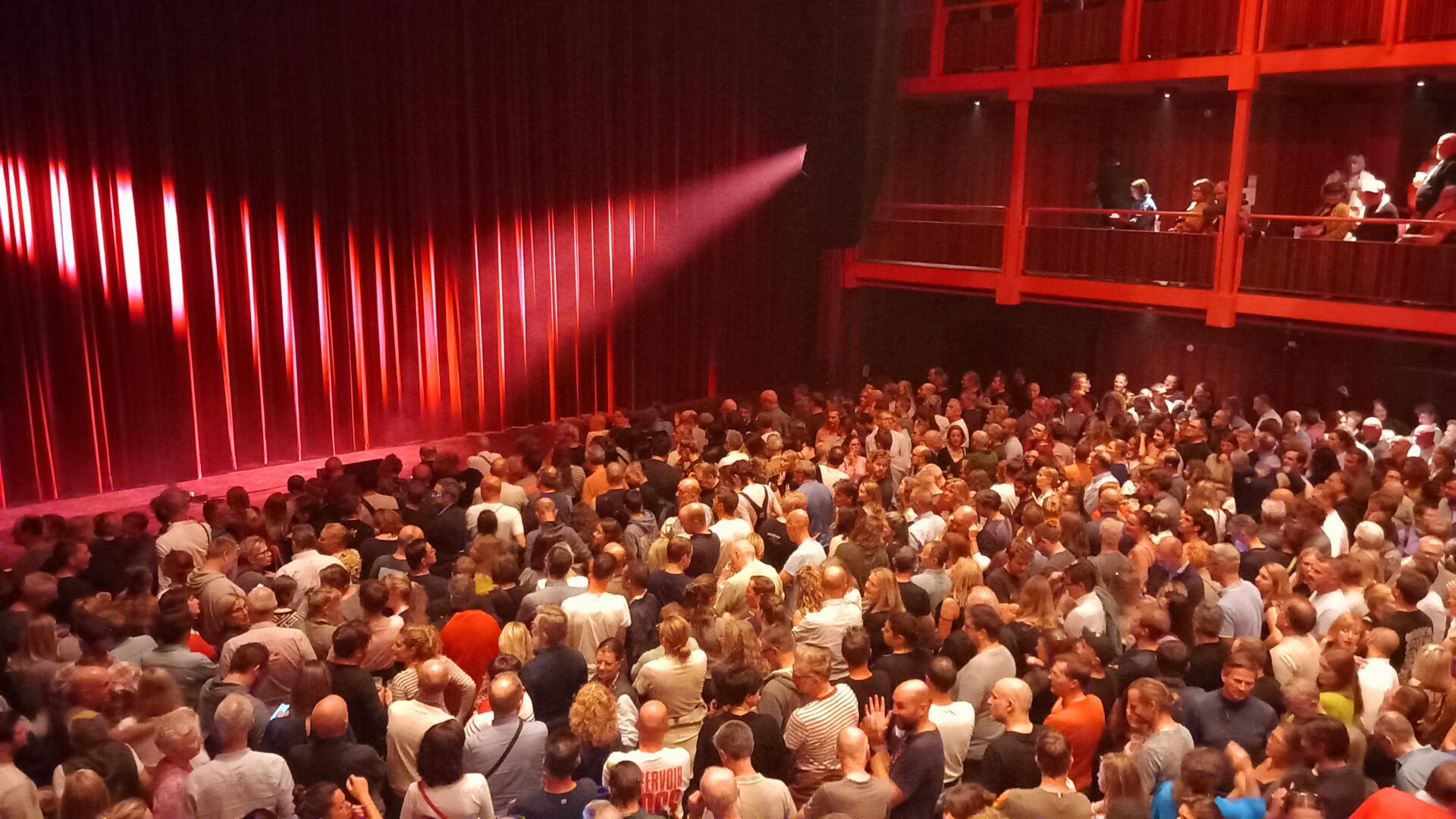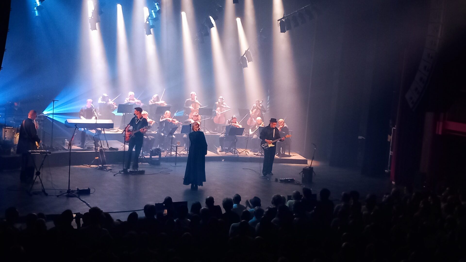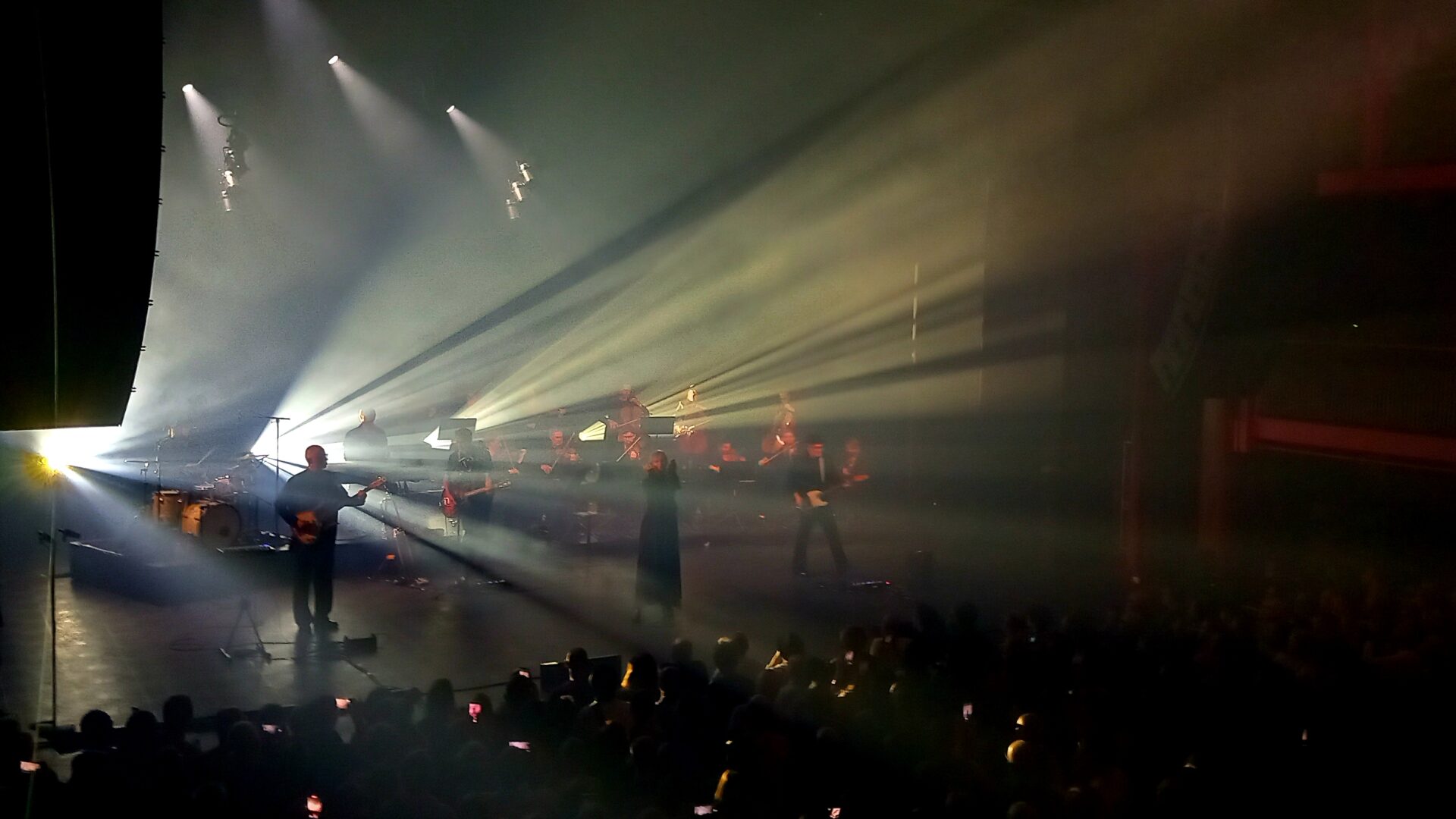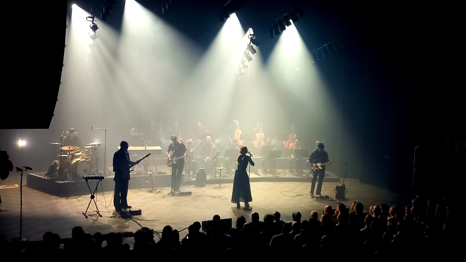 Dans la salle, la scène est dissimulée derrière un élégant rideau rouge vif qui ne dévoile strictement rien, ne laissant par conséquent filer aucun indice sur le déroulement et la forme que va prendre le concert. Lorsque les lumières s’éteignent et que la scène se dévoile, c’est pour nous laisser découvrir le groupe accompagné d’un ensemble de 12 instruments à cordes (3 violencelles et 9 violons). Hooverphonic n’a pas fait les choses à moitié et le rendu visuel est du plus bel effet. Après une intro très electro, atmosphérique mais aussi très influencée par le trip-hop, on entre dans le vif du sujet.